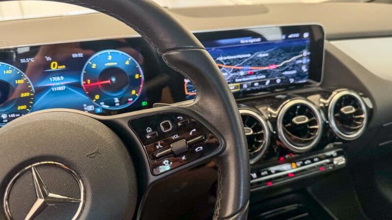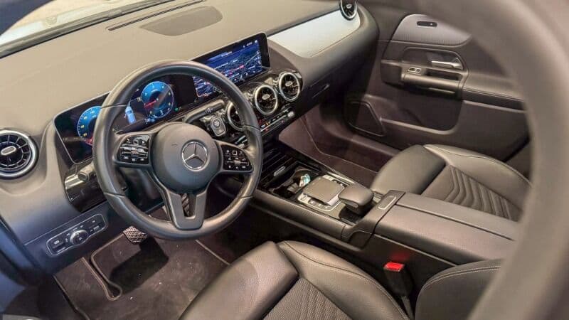El habitáculo del Clase B sorprende por su amplitud interior y versatilidad. El sistema MBUX con pantalla táctil, los asistentes de aparcamiento y los múltiples sistemas de seguridad activa hacen que cada trayecto sea cómodo y seguro. El maletero ofrece una capacidad generosa para un vehículo de su segmento.