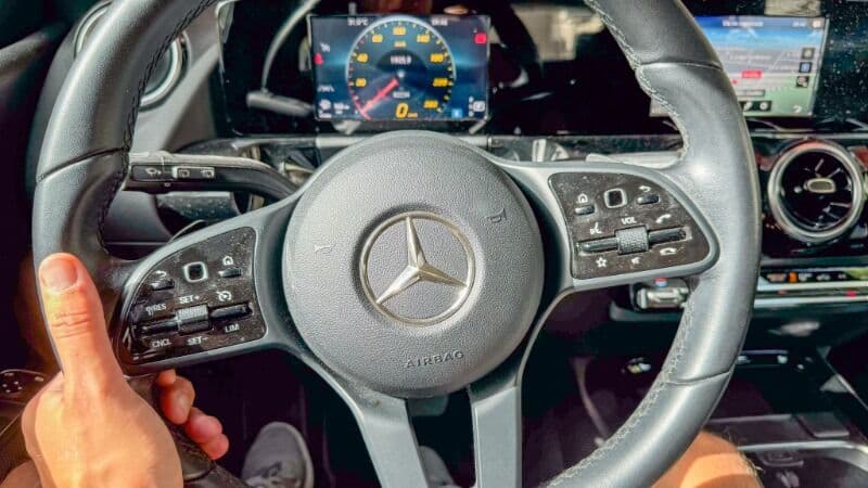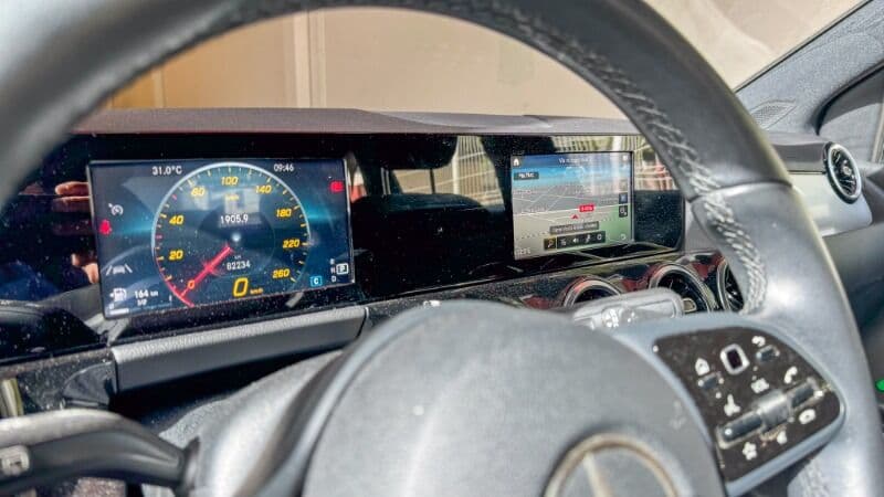 El interior cuenta con los últimos avances tecnológicos de Mercedes-Benz: sistema MBUX con control por voz, cuadro de instrumentos digital, climatización automática y un completo paquete de seguridad que incluye frenada de emergencia y control de ángulo muerto.