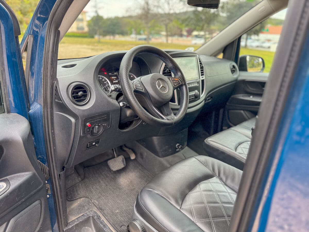 El elegante color azul marino confiere un aspecto profesional y distinguido. El interior cuenta con acabados de calidad Mercedes-Benz, climatización independiente para los pasajeros y sistemas de seguridad avanzados que protegen a todos los ocupantes.